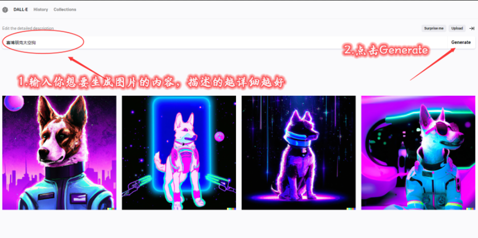 小技巧:如果你不知道这里的内容写什么,可以到用法一 chatgpt让ai帮你生成一段要描述的场景或事物,然后复制到Dalle2这里